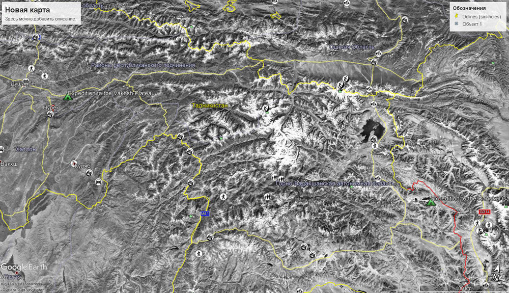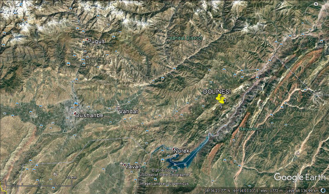 Our Tajik colleagues provided information about an interesting and promising karst plateau, which is located in the north of the Vakhsh River. The nearest town is Nurek. Nurek is the energy capital of Tajikistan, where the Nurek hydropower plant was built.