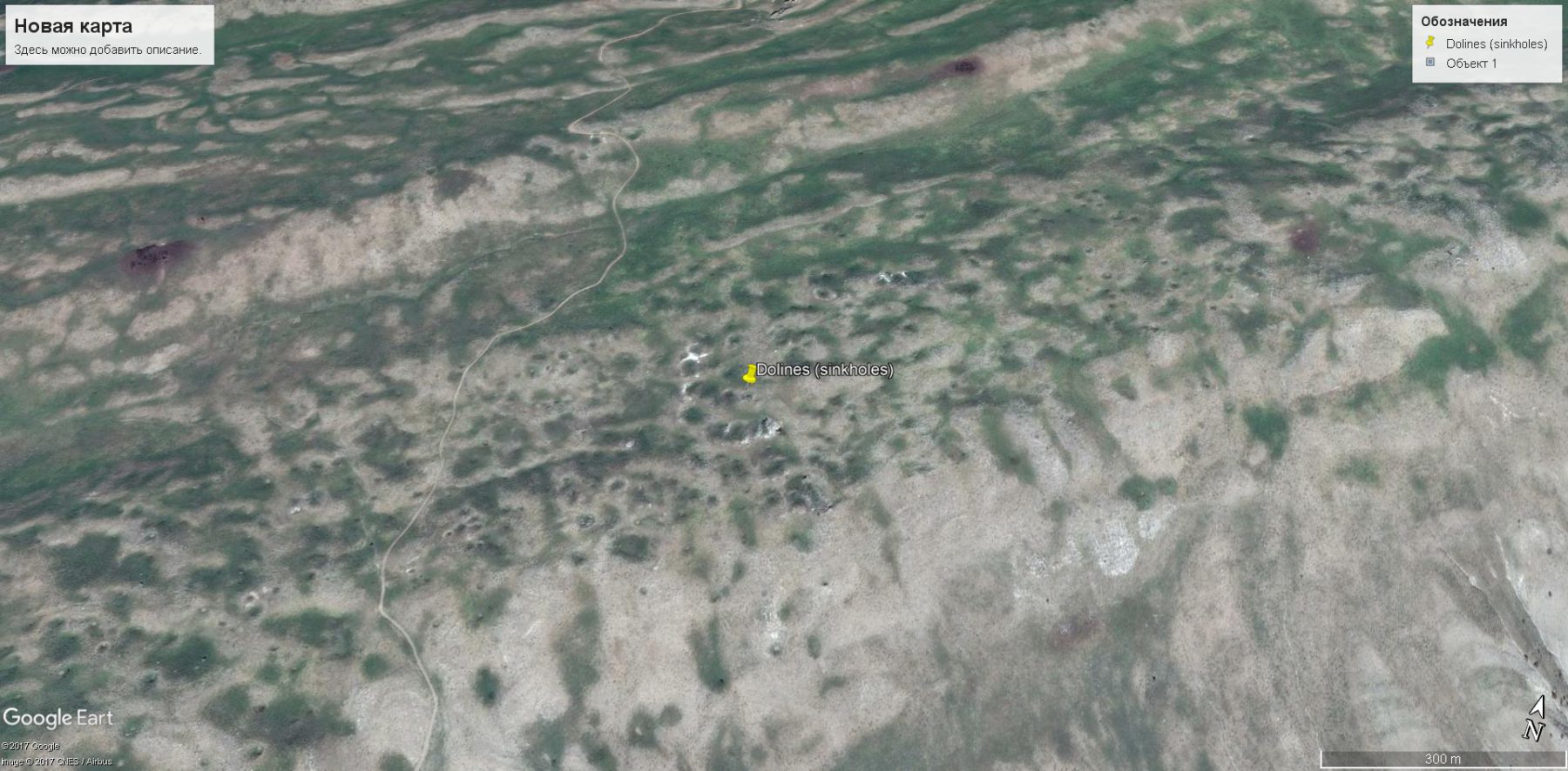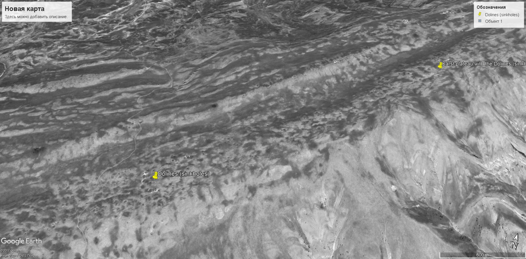 The karst plateau extends from the northeast to the southwest. The total length of the plateau, is more than 30 km, a width of about 1 km. The excess over the base of the slopes is of 300-400 meters. On the plateau were found numerous sinkholes (see satellite image). The diameter of the sinkholes reaches 20-23 meters.